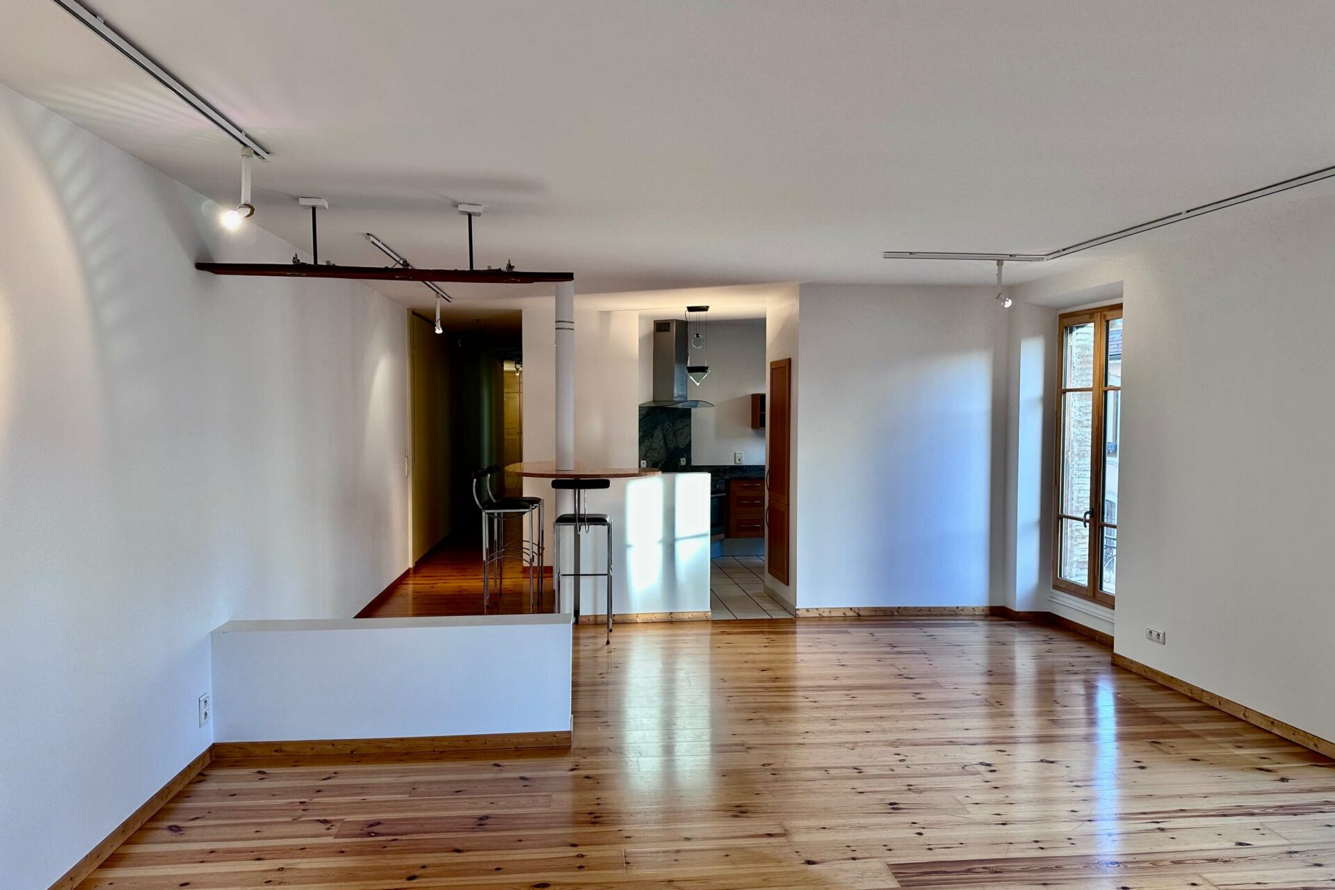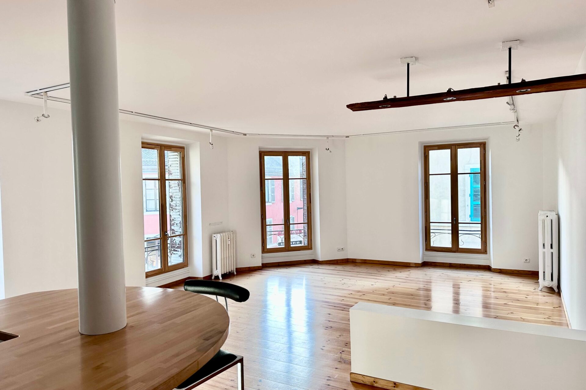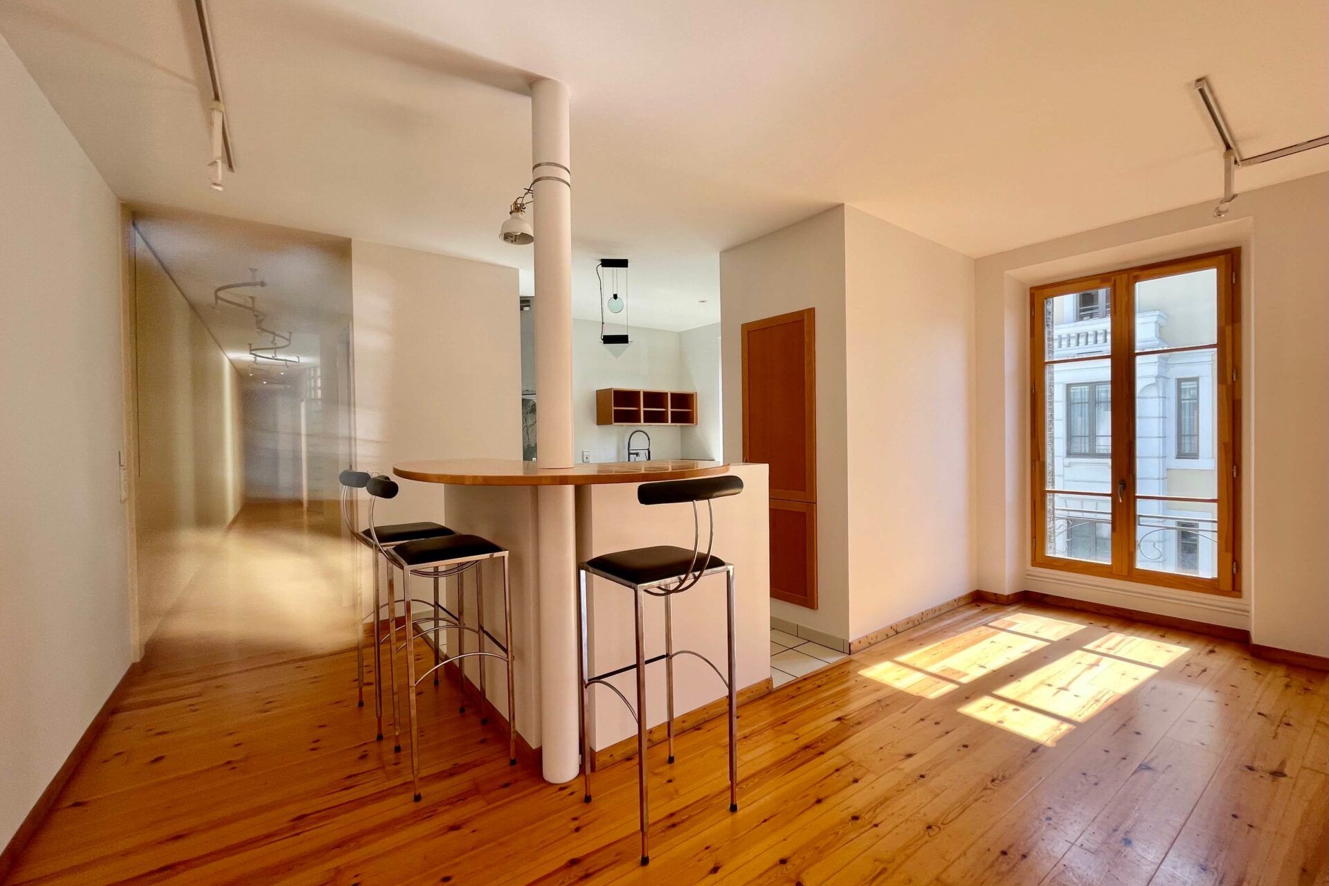 Situé au 2ᵉ étage, ce magnifique appartement de 110 m² à la vue dégagée sur la ville et ses rues piétonnes séduit par son authenticité et ses plafonds hauts qui renforcent la sensation d’espace.